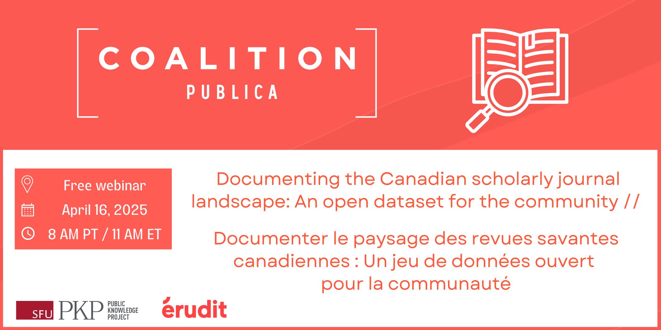 The subject of numerous studies in recent years, Canadian scholarly journals are essential for the dissemination of Canadian research. However, it remains difficult to get an overall picture of the composition of these journals. Recently, Coalition Publica has developed and published a detailed, open inventory of the historic and active journals that make up the national research dissemination landscape. In this one-hour webinar, we presented the methodology behind its creation, provided some insights offered by its analysis, and demonstrated how it is already being put to use by different actors in the field.