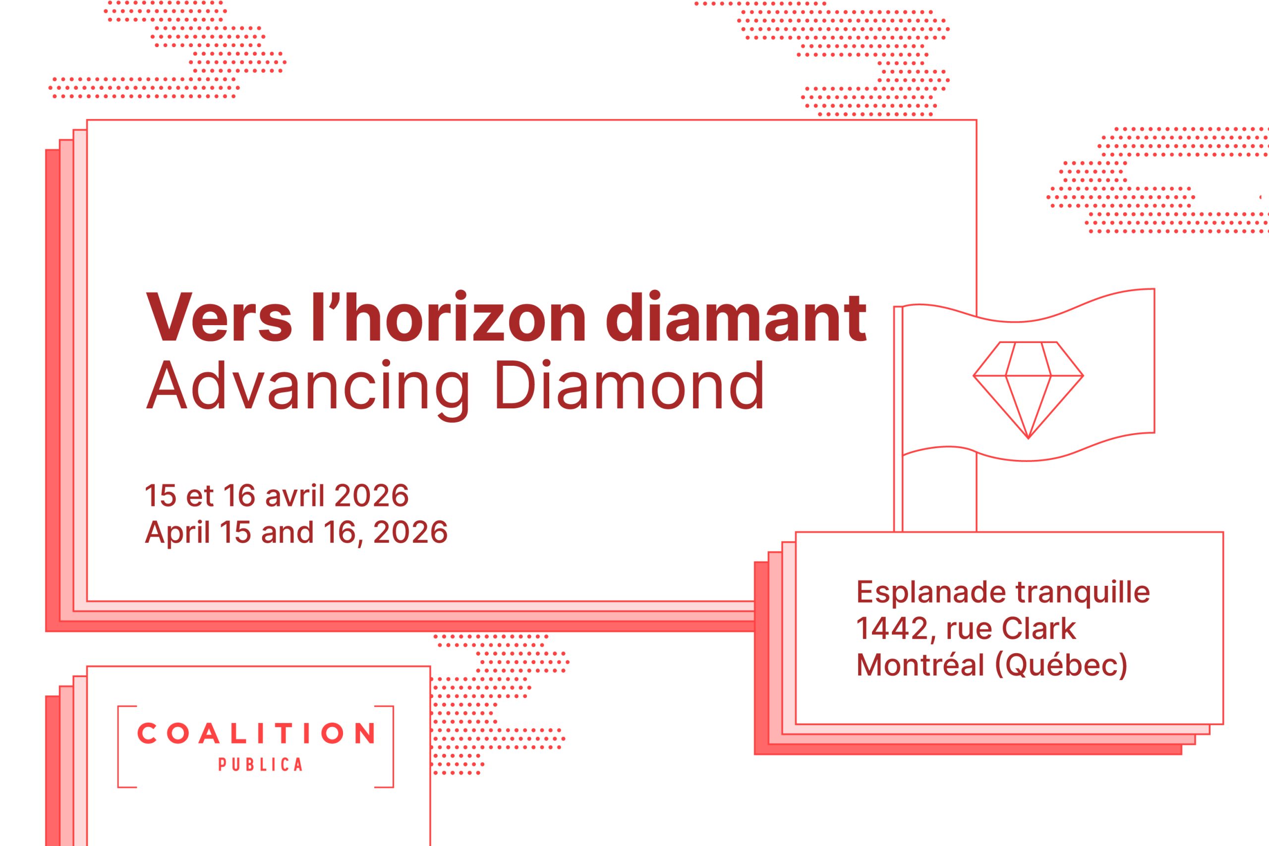 Vers l’horizon diamant / Advancing Diamond est un événement en présence qui rassemblera des chercheur·euse·s, des bibliothécaires, des membres d’équipes éditoriales, des éditeurs, des organismes subventionnaires, des fournisseurs d’infrastructure et d’autres parties prenantes afin d’établir une vision commune de la publication en libre accès diamant au Canada.