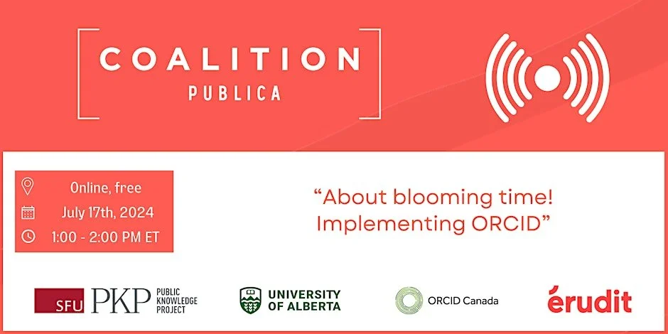 Coalition Publica invites you to hear from our panelists who will share ORCID developments in their institutional contexts, including implementation projects, future plans, and lessons learned. With plenty of time for questions and answers, this session is an opportunity to learn more about implementing ORCID in OJS and Érudit, deploying ORCID integrations at scale, what’s in store for the future, and how Canadian infrastructures are working together to make ORCIDs and other persistent identifiers (PIDs) interoperable. From concrete examples to national strategy, we hope this will be an opportunity for the library publisher community and the journals they work with to see how they could benefit from implementing ORCID.