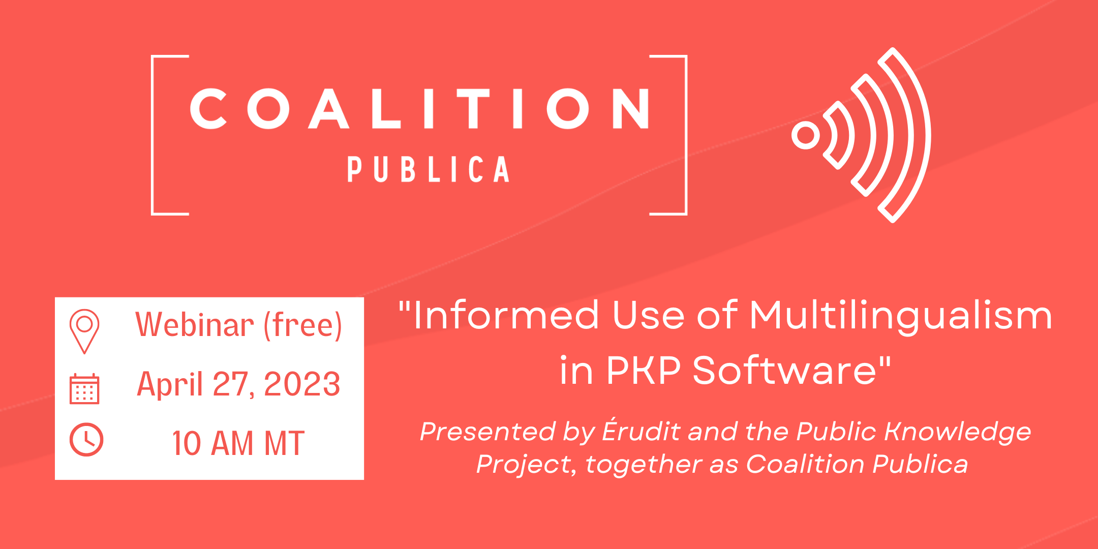 The community is invited to join this free webinar on challenges, benefits, publishing options, how-to steps, and best practices for basic multilingual metadata use in PKP software. The Webinar is presented by Érudit and PKP, together as Coalition Publica.